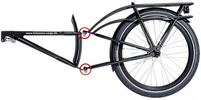 Die besonders stabile und sichere Verbindung besteht aus einem sehr stabilen vorderen Rahmen (Joch), welcher mittels unterschiedlicher Adapter (für alle Achssysteme als Zubehör erhältlich) fest am Zugfahrrad verschraubt wird und so für eine erstaunliche Stabilität des FollowMe-Lastenanhängersystems sorgt. Das vordere Joch wird beidseitig an der Hinterradnabe des Zugfahrrades aufgesetzt und verschraubt. Dazu werden zuerst spezielle FollowMe-Achsadapter am Zugrad ein- oder aufgeschraubt (als Zubehör erhältlich). Auf diese wird dann das Rahmenjoch aufgesetzt und nochmals beidseitig mittels Flügelbefestigungsschraube und Zusatzsplint doppelt gesichert.